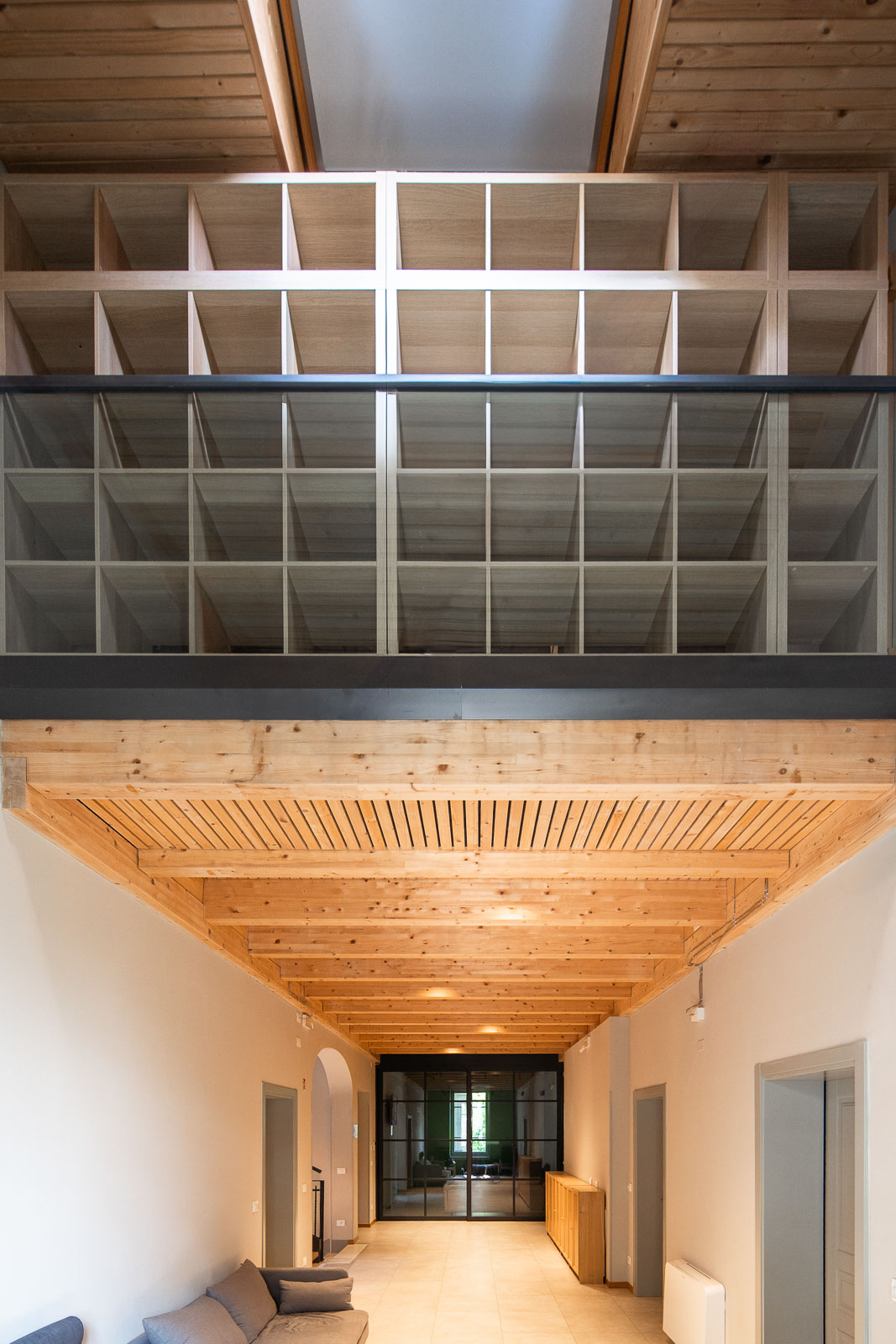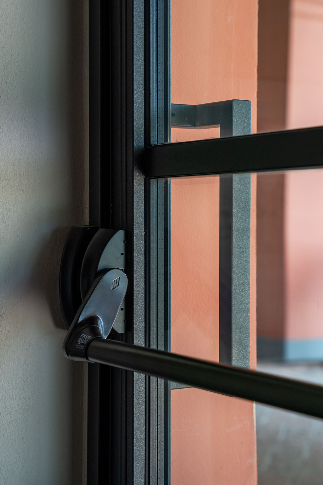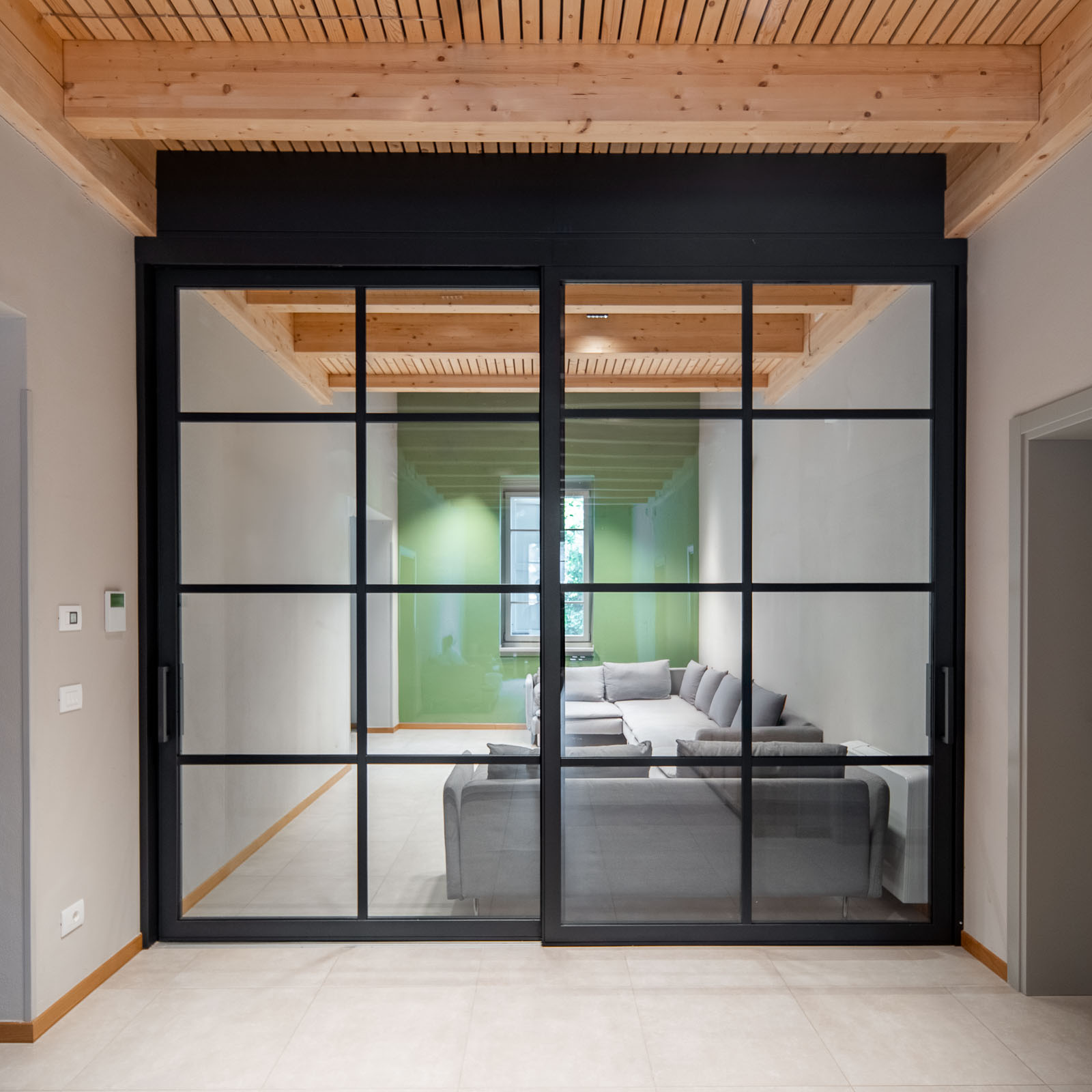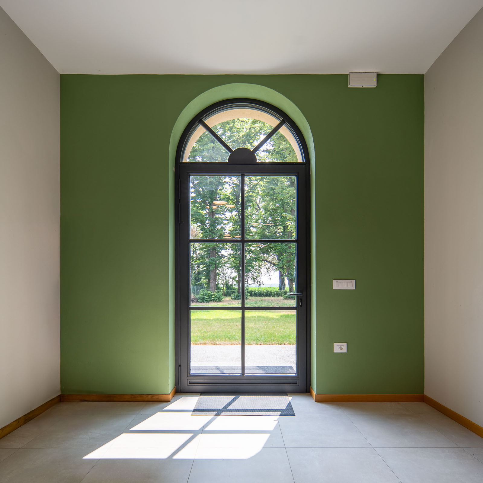 Per questo intervento, Erreci Architecture ha realizzato tutti i serramenti in acciaio del piano terra, contribuendo all’equilibrio tra recupero filologico e funzionalità contemporanea. In particolare, sono stati realizzati gli ingressi sia del fienile che della villa con profili OS275 in acciaio zincato verniciato di Secco Sistemi, con inglesine applicate che richiamano l’estetica originaria del complesso. Per gli interni sono state realizzate vetrate e pareti divisorie in profilo SA15 a taglio freddo, sempre Secco Sistemi, ideali per una suddivisione leggera e trasparente degli ambienti, mantenendo continuità visiva e apertura tra gli spazi.
